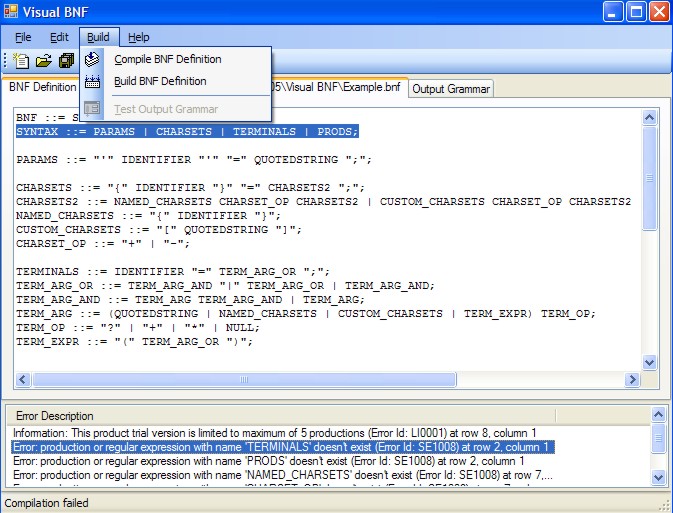 This product offers visual coding of BNF (Backus Naur form) syntax, compilation and generation of output parse table dll (dynamic link library), which then can be integrated with Your application.